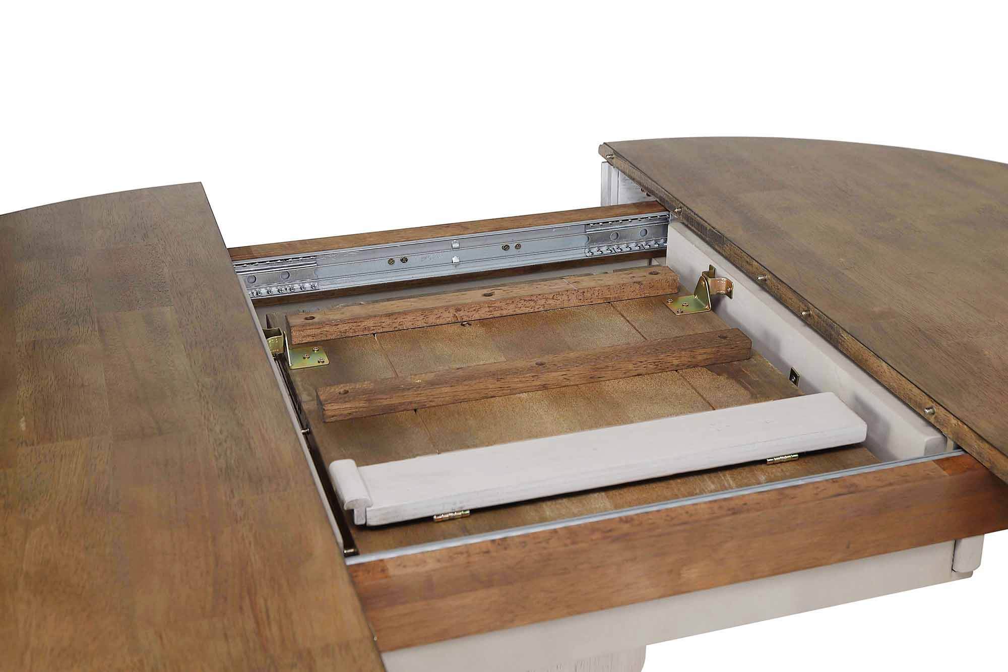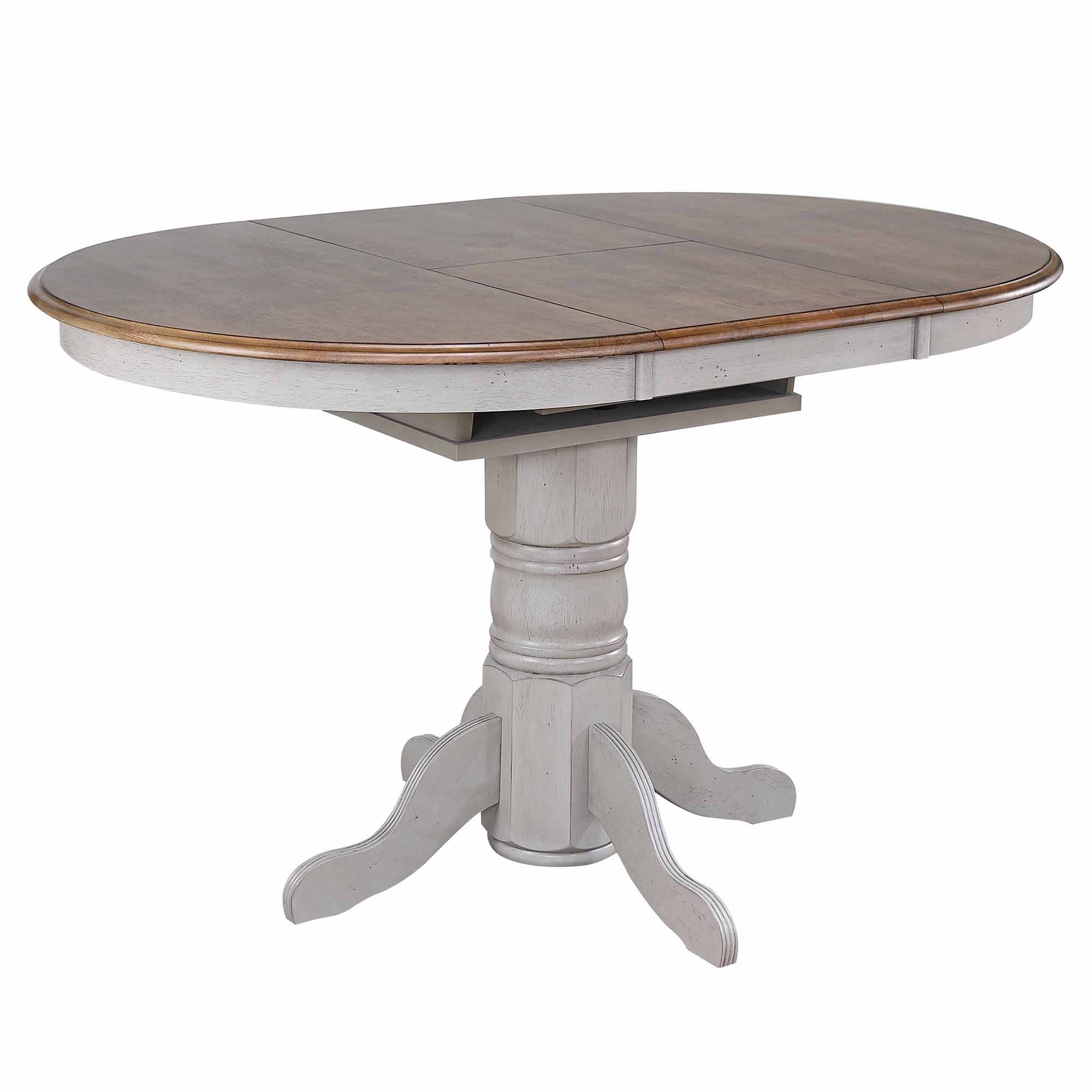 Update your dining room or kitchen with this two sized expandable café dining table. The two-tone palette pairs weathered gray with natural brown for a contemporary blend that can complement any decor from transitional to cottage. This French country furniture adds a well-defined rustic farmhouse feel to your dining room and is ideal choice for smaller spaces, it easily extends for larger gatherings with one self-storing leaf expanding the table from 42 to 60 inches. Constructed from solid eco-friendly Malaysian oak and veneers, this pedestal counter height dining table is truly timeless and looks fantastic when paired with other pieces in the Cottage Grove Collection.