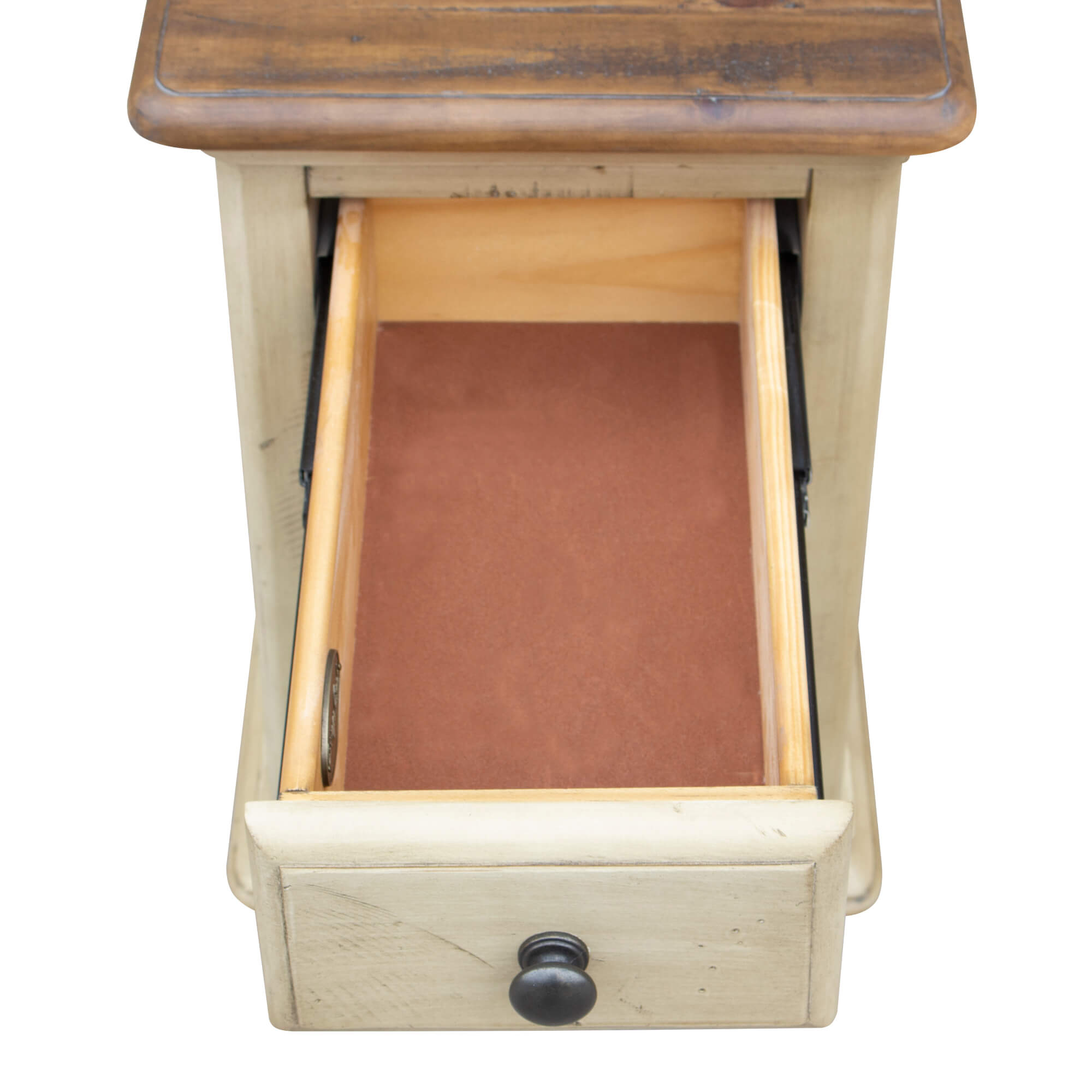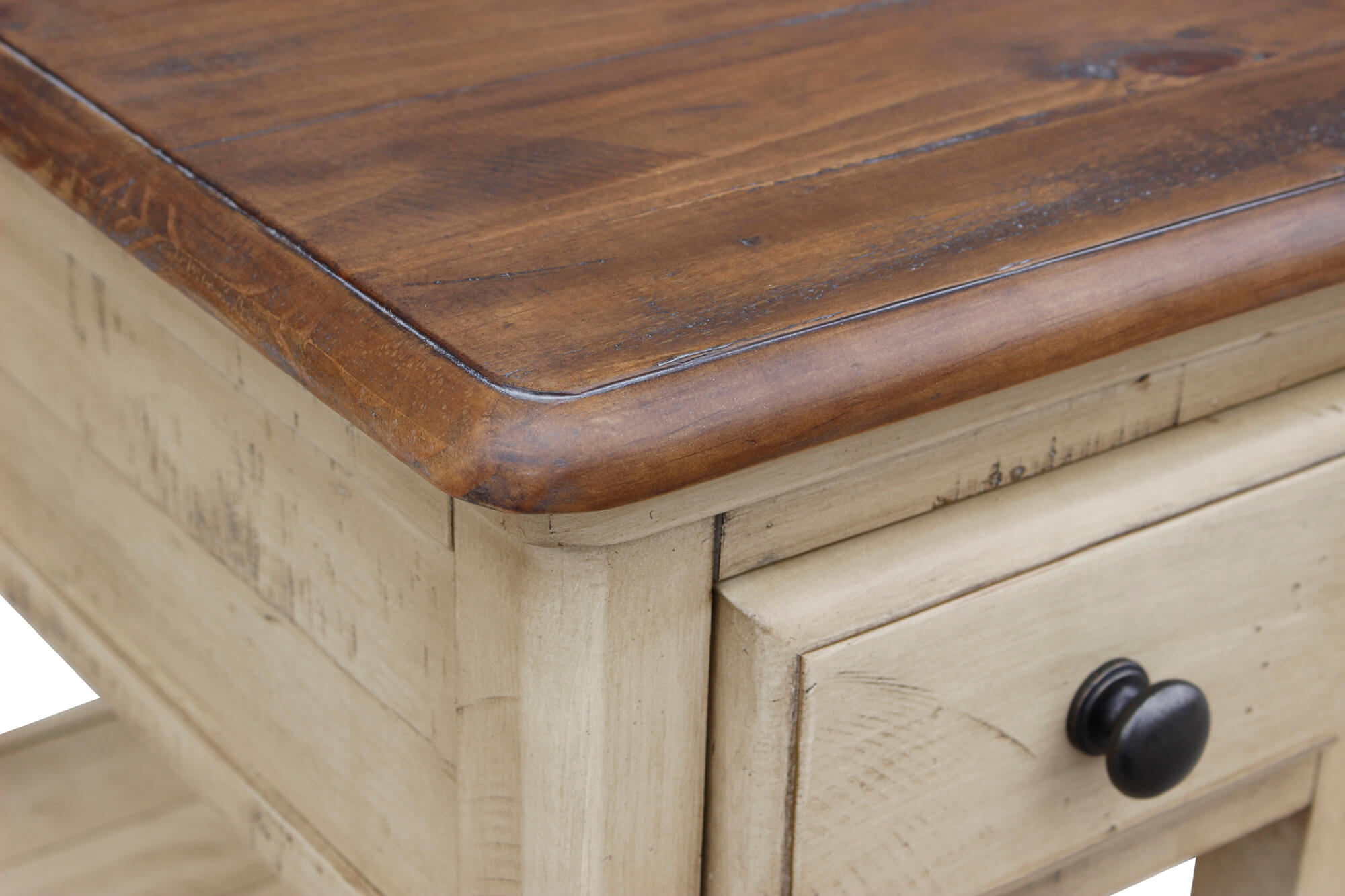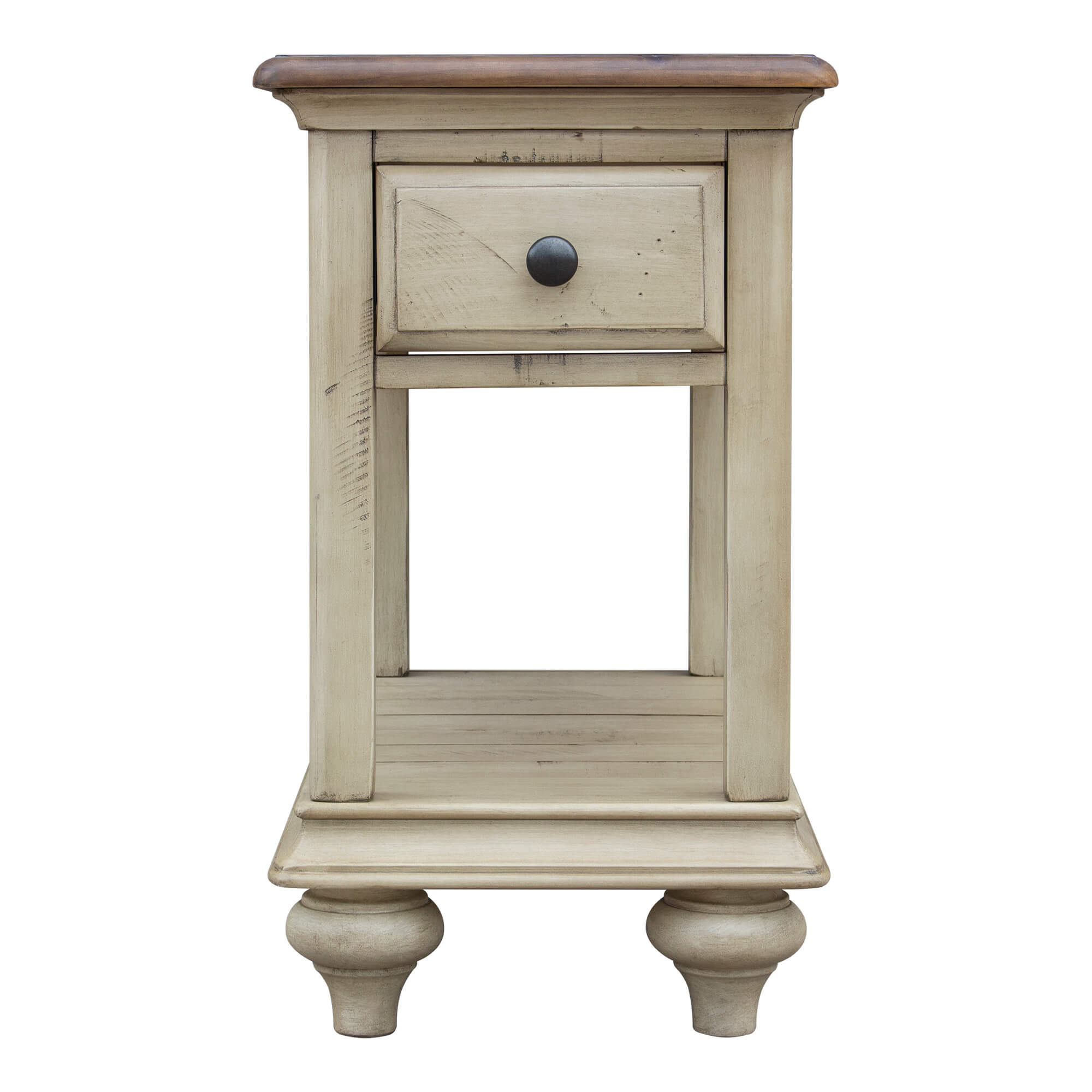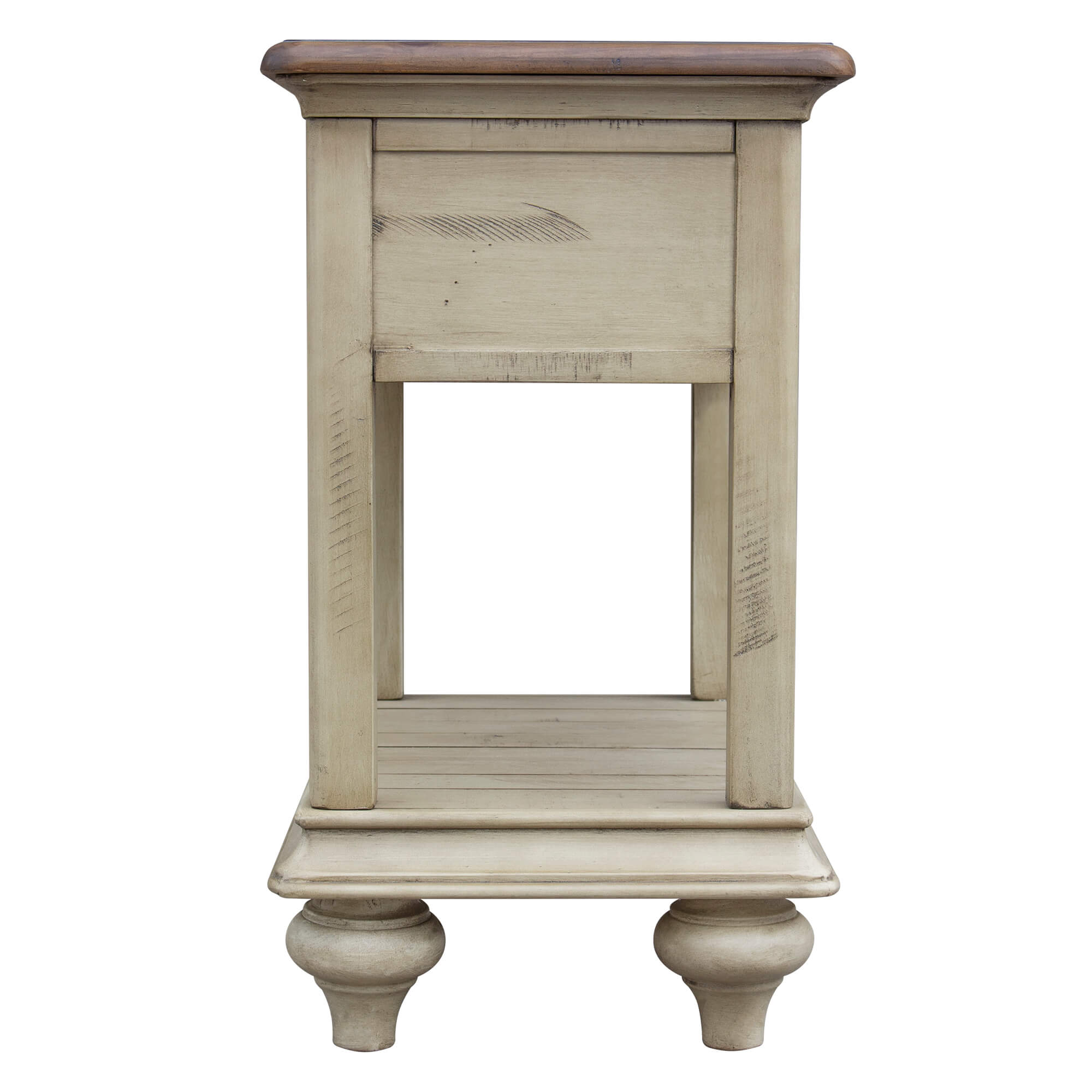 Farmhouse charm with an island vibe, this narrow and open sofa side table will add coastal living style to your lake house, country cottage or high rise. The antique white will brighten your living room while the walnut will blend with your traditional decor. Perfect size end table if you do not have much space to waste and a few things to store. Place a lamp on top reading materials on the bottom and pull up to your favorite club chair or recliner. Designed with small space living in mind, this small living room table is a great find. Authentic wood planks and bun feet ground the little table with contemporary style. Like the surf hitting the sand, have one room flow into the other, create a curated look with matching bedroom collection.