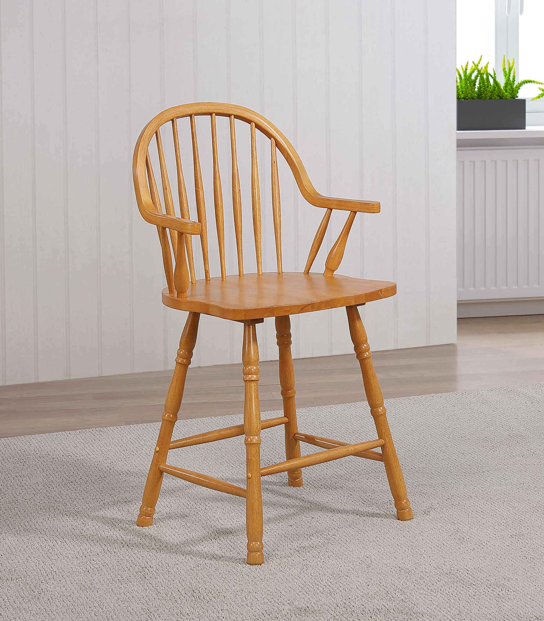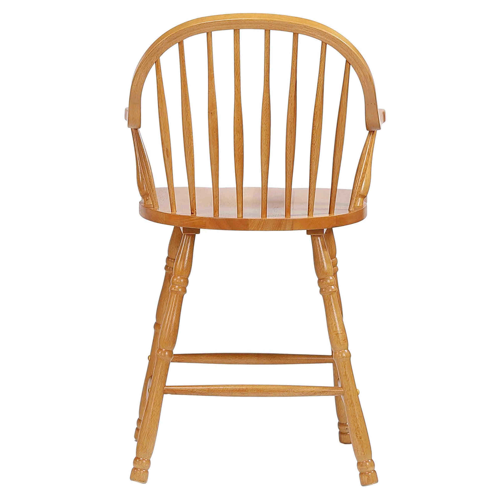 Windsor barstools are famous for their uncomplicated and universal design. Transform a kitchen counter into a cozy breakfast bar with these low profile spindle back counter stools. The seat has a saddle shape to assure maximum comfort with arms that give just the right support, yet slightly short, enabling you to sit down and get up with ease. Constructed from solid Asian hardwood, this farmhouse chic barstool is truly timeless and looks fantastic when paired with other pieces in the Sunset Oak Selections Collection. Manufacturer ID: DLU-B3024-LO-A-RTA